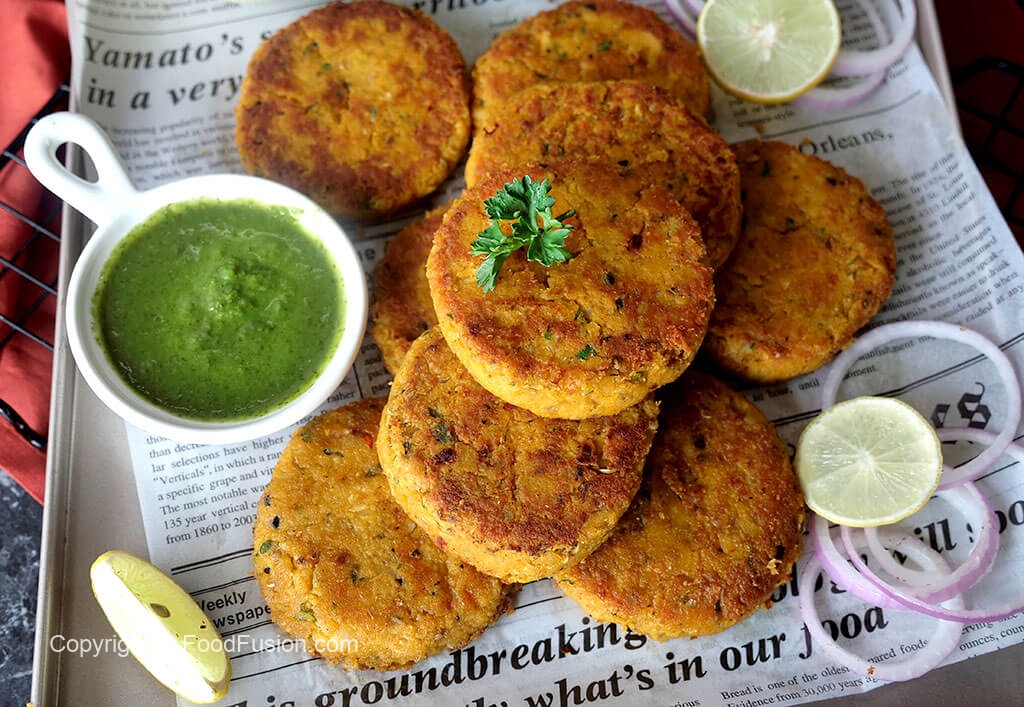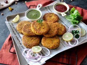 Grease hands with oil,take small quantity (60g) & make kabab of equal sizes (makes 19-20).