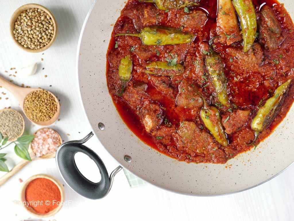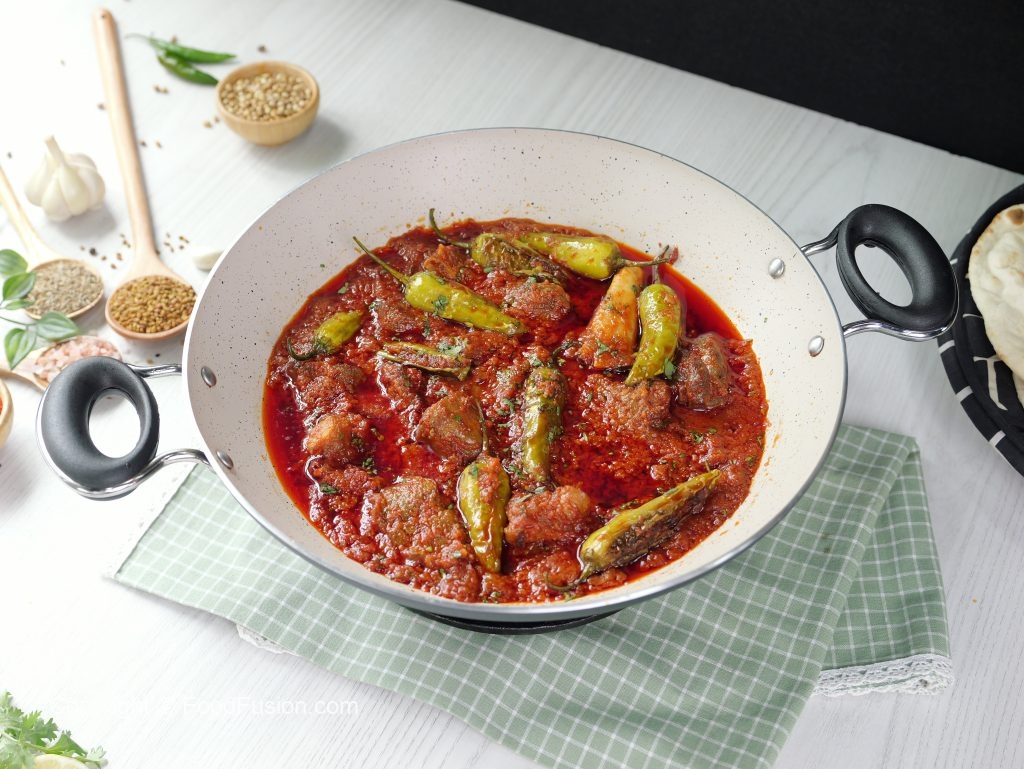 -Fried stuffed chillies ko mutton gravy mein dal dein aur lemon juice dal ker dhak dein aur halki ancch per 3-4 minutes kliya paka lein.