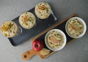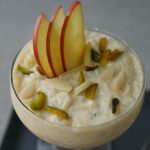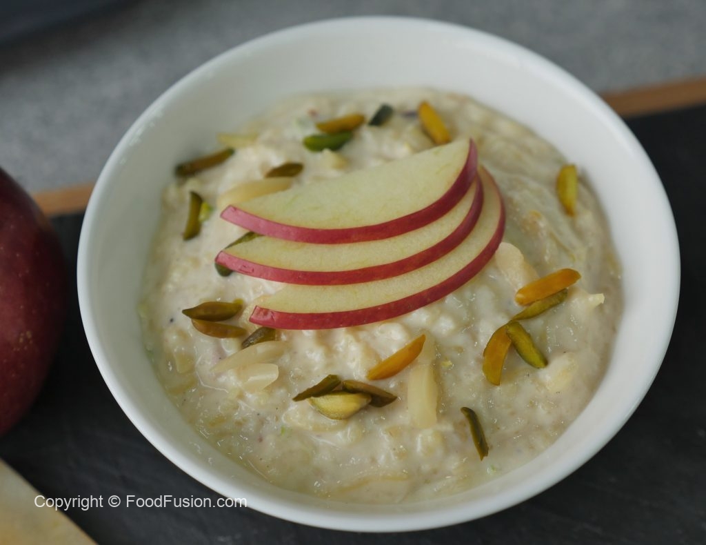 In serving dish,add apple kheer and garnish with apple slices,pistachios and almonds.