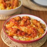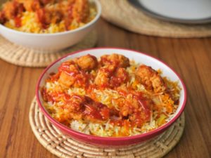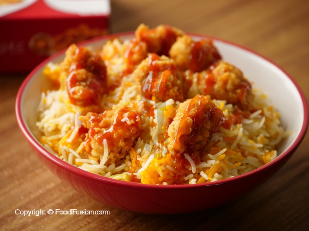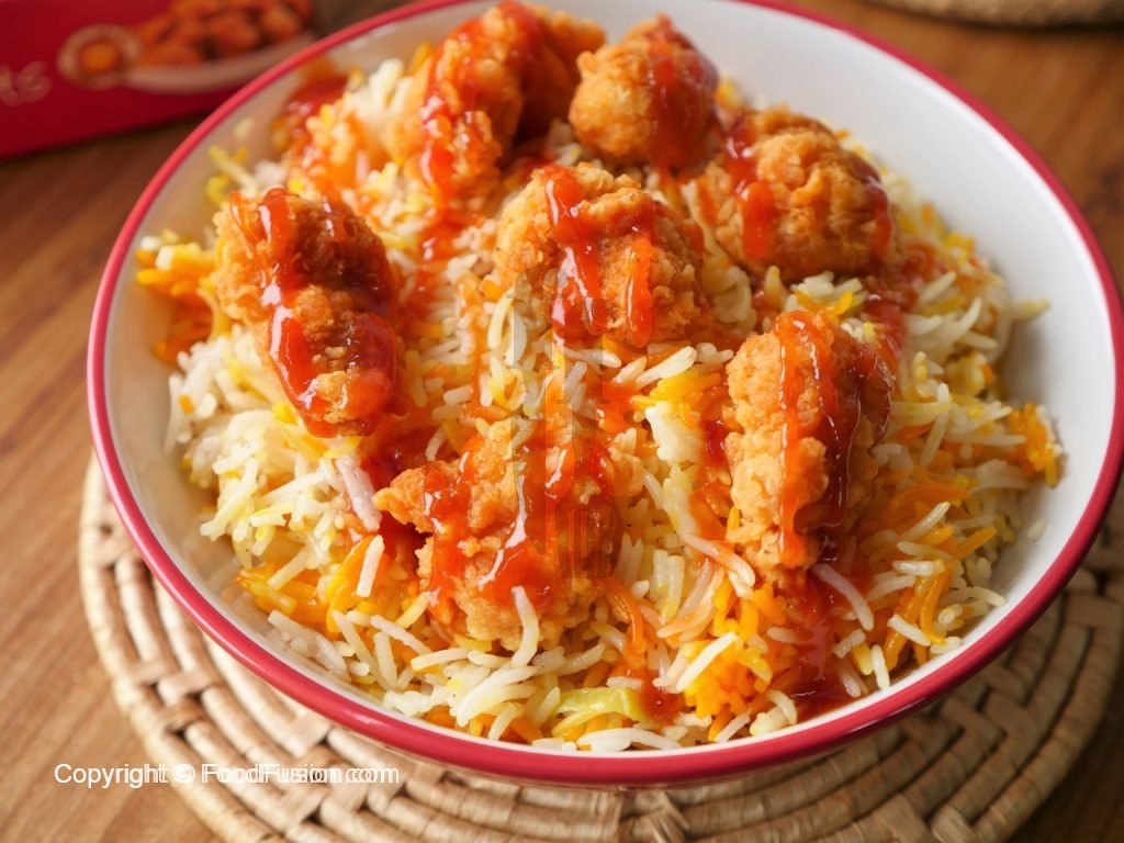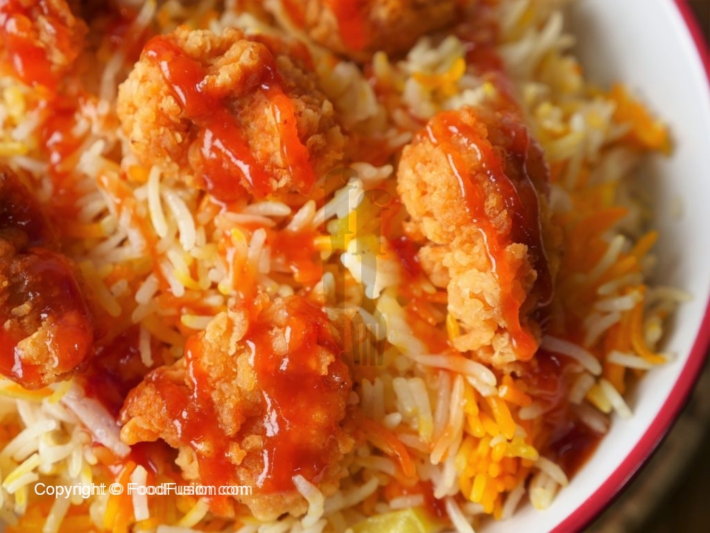 In serving dish,add cooked rice,fried chicken shots and drizzle red sauce.