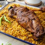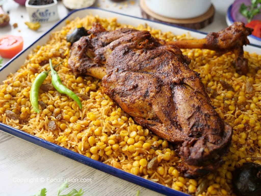 -On a serving platter,add & spread prepared rice,daal & raisins,mutton leg & garnish with green chillies & serve!