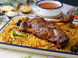 -Serving plate mein tayyar chawal,daal & raisins aur mutton leg dal dein aur hari mirch sa garnish ker ka serve karein!