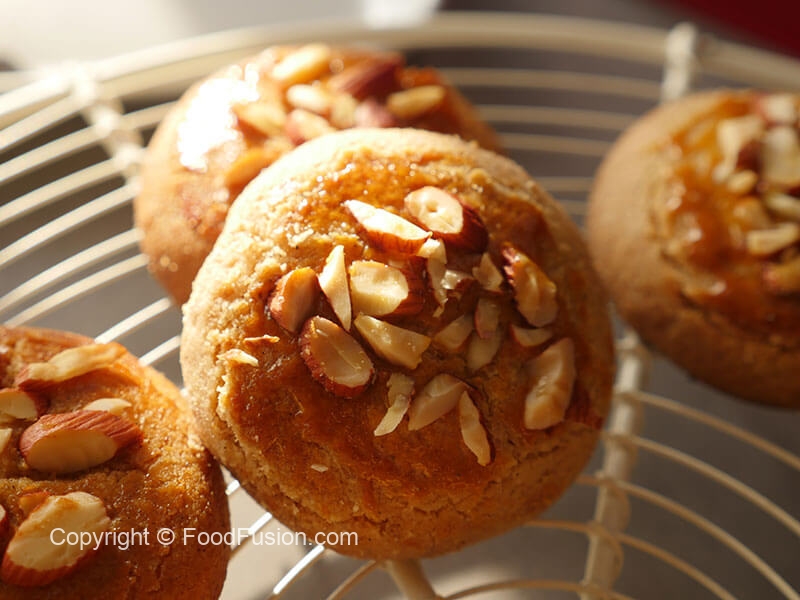 Place them in a baking tray,apply egg yolk with the help of brush,add almonds & press gently (keep some space between them as they expand while baking).