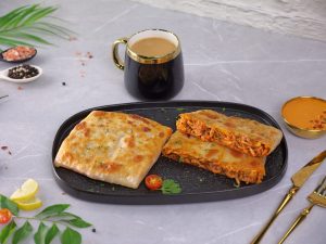 -Add 2 tbs of whisked eggs,onion,fresh coriander,green chilli,cheddar cheese slice & fold all sides of dough,apply whisked eggs & seal properly.