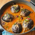 Take egg plants,make 4 small cuts in the eggplant but don’t separate them and keep them intact, including the stem,sprinkle salt and stuffed with ground spice mixture & set aside.
