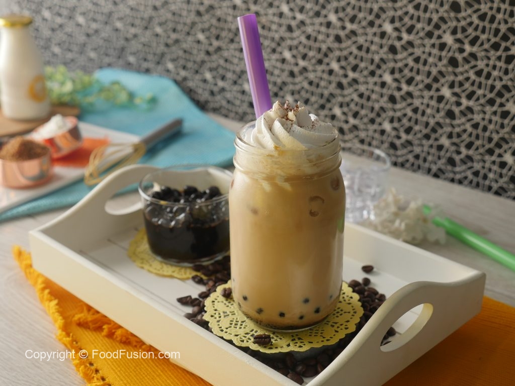 In a serving or mason jar,add ice cubes,prepared boba pearls with syrup,prepared black coffee, prepared milk syrup and top it with whipped cream,sprinkle cocoa powder & serve!