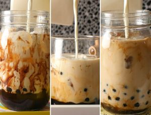 Serving or mason jar mein ice cubes,tayyar boba pearls syrup ka saath dal dein,tayyar black tea aur milk creamer dal dein,whipped cream aur brown sugar dal dein aur blow torch sa burn ker ka serve karein!