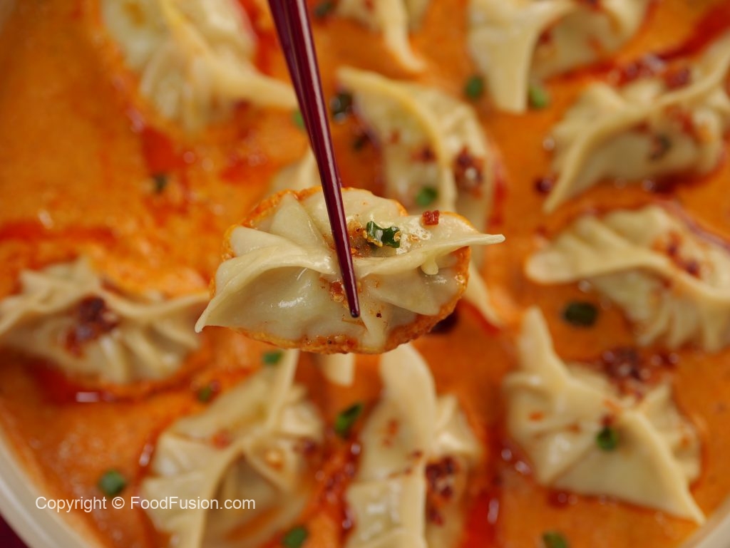 -On serving plate,pour prepared butter chicken sauce,place prepared dumplings,pour chilli oil,green onion leaves & serve!