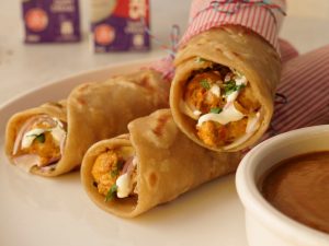 On a paratha,add butter chicken,onion,fresh coriander,cream & fold to make a roll,warp in butter paper & serve with chutney (makes 6).