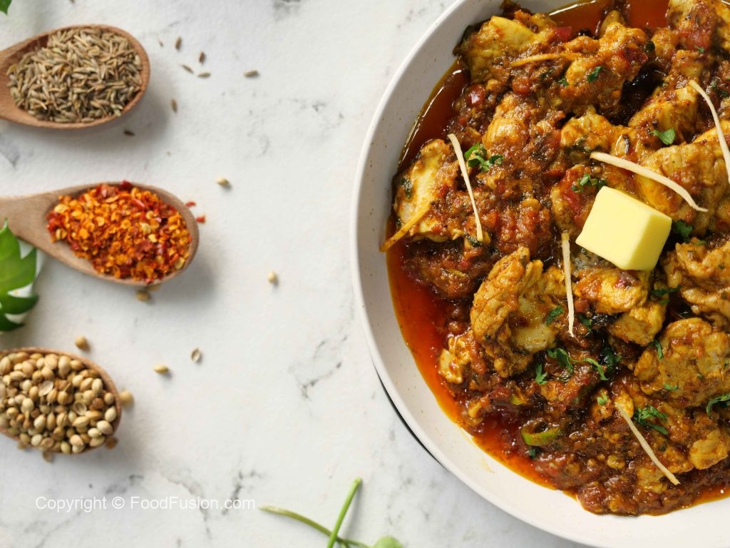 -Pink salt,lal mirch crushed,sabut dhania,garam masala powder,haldi powder,kali mirch crushed,lal mirch powder aur zeera powder dal ker ache tarhan mix karein aur darmiyani ancch per oil alag ho janay tak paka lein (1-2 minutes).