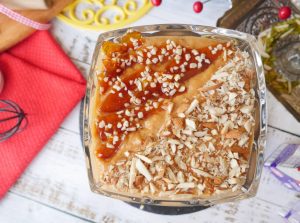 In serving dish,add caramel firni,garnish with almonds,caramel crunch & serve!