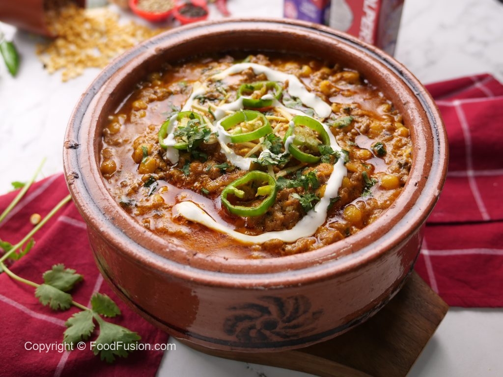 -Add prepared chana daal qeema & garnish with fresh coriander,ginger,green chilli,cream & serve!