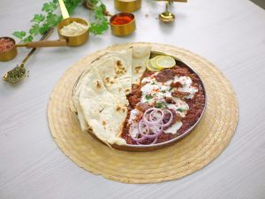 -In a serving platter, add Chapta Cut Kabab Masala, add whisked yogurt, garnish with kashmiri red chilli powder, onion rings, reserved kabab pieces, lemon slices & fresh coriander, and serve with naan!