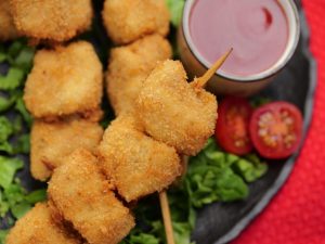 -Coat chicken skewers with all-purpose flour then dip in whisked eggs & coat with breadcrumbs.