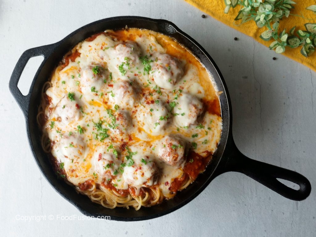 Add prepared meatballs with sauce,add cheddar cheese,mozzarella cheese & red chilli crushed,cover & cook on low flame until cheese melts (4-5 minutes).