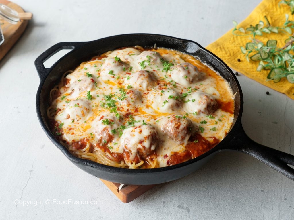 Tayyar meatballs ko sauce ka saath dal dein,cheddar cheese,mozzarella cheese aur lal mirch crushed dal dein aur dhak ker halki ancch per cheese melt ho janay tak paka lein (4-5 minutes).