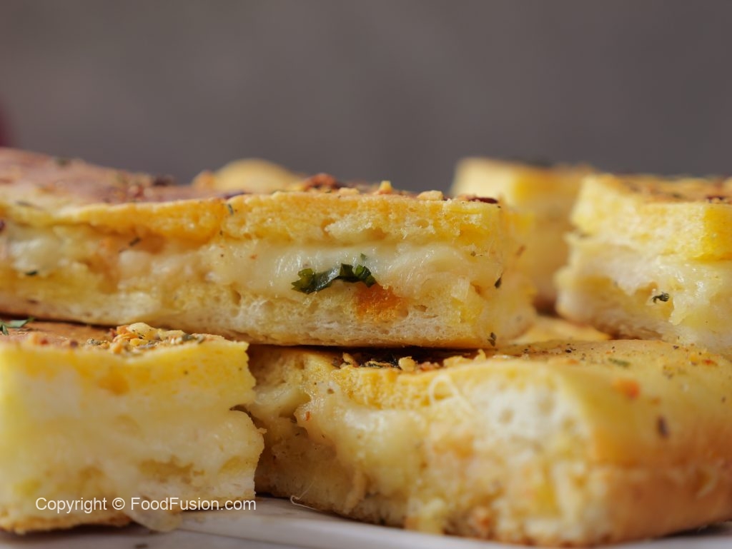 -Tayyar garlic butter aur cheese sauce dal ker pheela lein,mozzarella cheese dal ker upper sa ek aur bread ki side rakh dein.