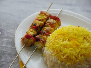Pyaz,red bell pepper aur chicken boneless cubes ko skewers per laga lein aur baqi bache hoye marinade bhi laga lein (makes 10-12).