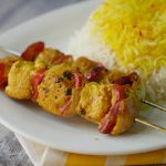 Thread onion,red bell pepper and chicken boneless cubes into skewers and basting with the remaining marinade (makes 10-12).
