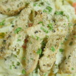 For Plating, add pasta first, then pour alfredo sauce, sprinkle cooked chicken and lastly add parmesan cheese and parsley on top for garnishing.