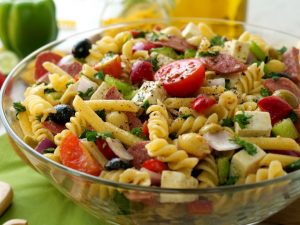 Boil fettuccine pasta with water, salt and oil. Drain, rinse with cold water and set aside.