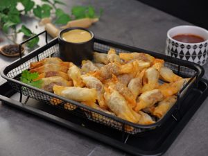 -Cut roll sheets (3x3 inches),add prepared chicken mixture (1 tsp),apply flour slurry & fold in candy shape.