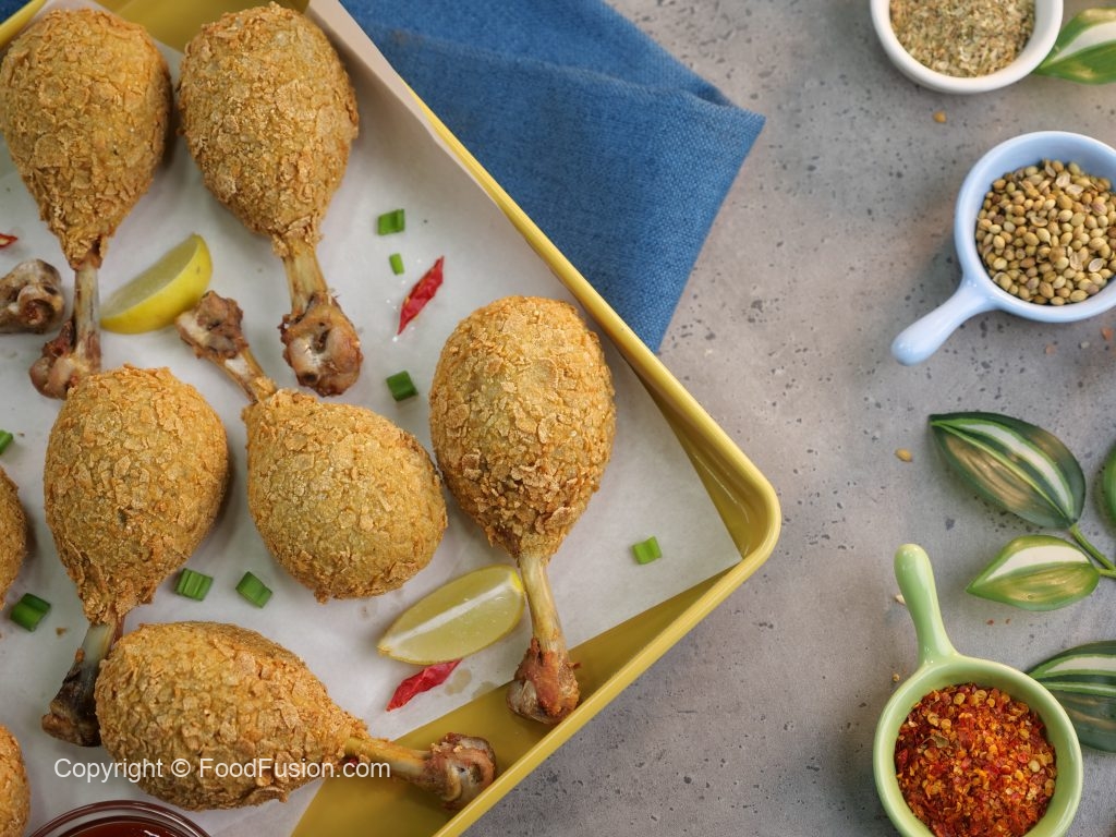 -Ab chicken drumsticks ko maida mein coat karein aur pheetay hoye anday mein dip ker lein phir cornflakes mein coat ker lein.