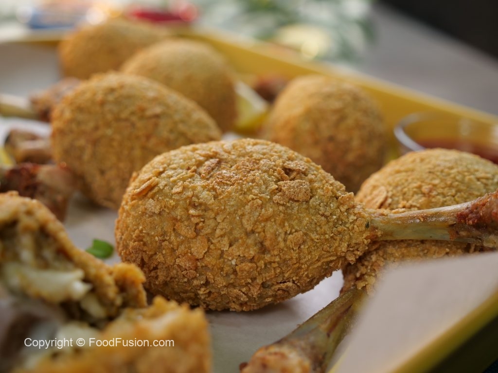 -Cheese dal dein aur reserved drumstick bone ko inert lein aur press ker ka drumstick ki shape bana lein.