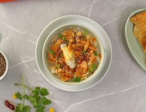 -In a serving bowl,add soup,boiled egg,black pepper crushed,chilli oil,shredded chicken,spring onion leaves,papri & serve!