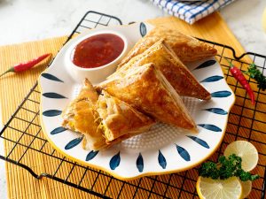 On each puff pastry square,add prepared filling & egg wedge in the center (skip egg if storing),apply water on the edges,flip the other side & press the edges to stick together and prick with fork to seal the edges (makes 18).