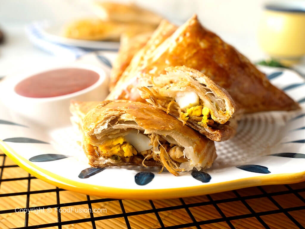 Lined baking tray with butter paper,place chicken curry puffs,apply egg yolk & bake in preheated oven at 180C for 25-30 minutes.