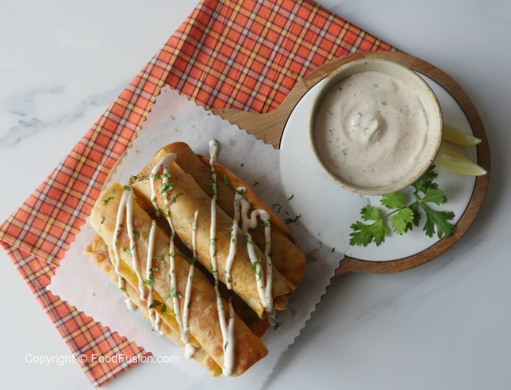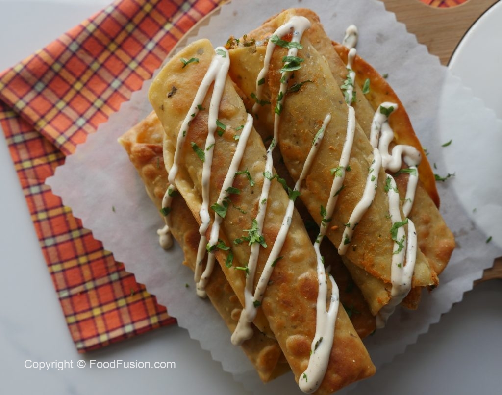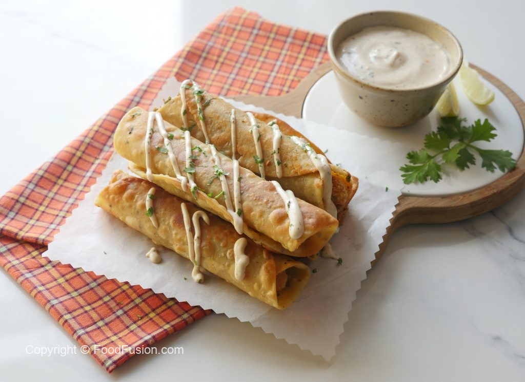 Corn tortilla per cheese mixture aur chicken fries dal ker roll ker lein aur toothpick laga lein.