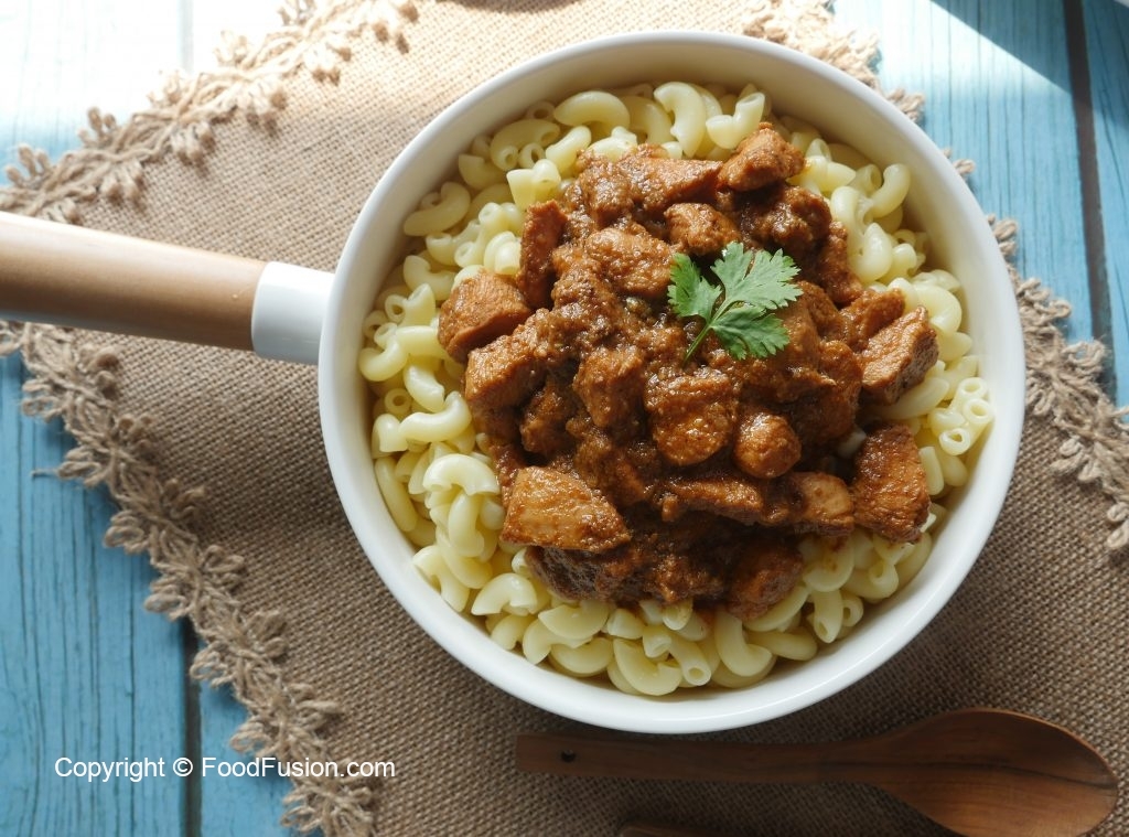 Serving dish mein boiled macaroni aur korma masala dal ker serve karein!