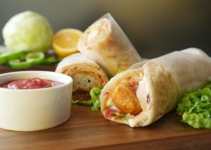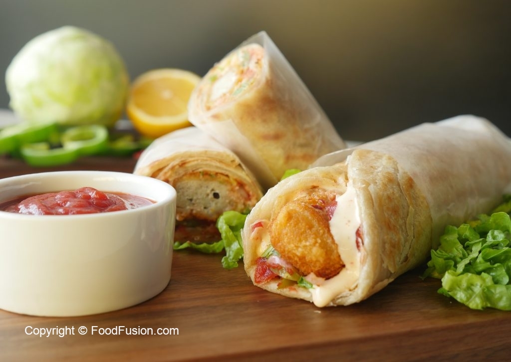 Paratha per tomato ketchup,stir fried vegetables,fried chicken nuggets aur tayyar cream & cheese sauce dal dein aur butter paper mein wrap ker ka serve karein!