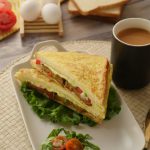Add onion,tomato,green chilli,fresh coriander and cheese slice and flip the other bread slice over it,press gently & cook on low flame until cheese melts.