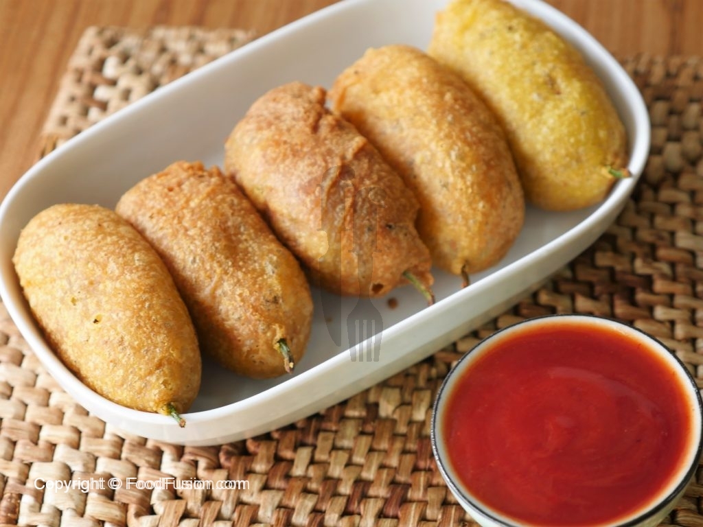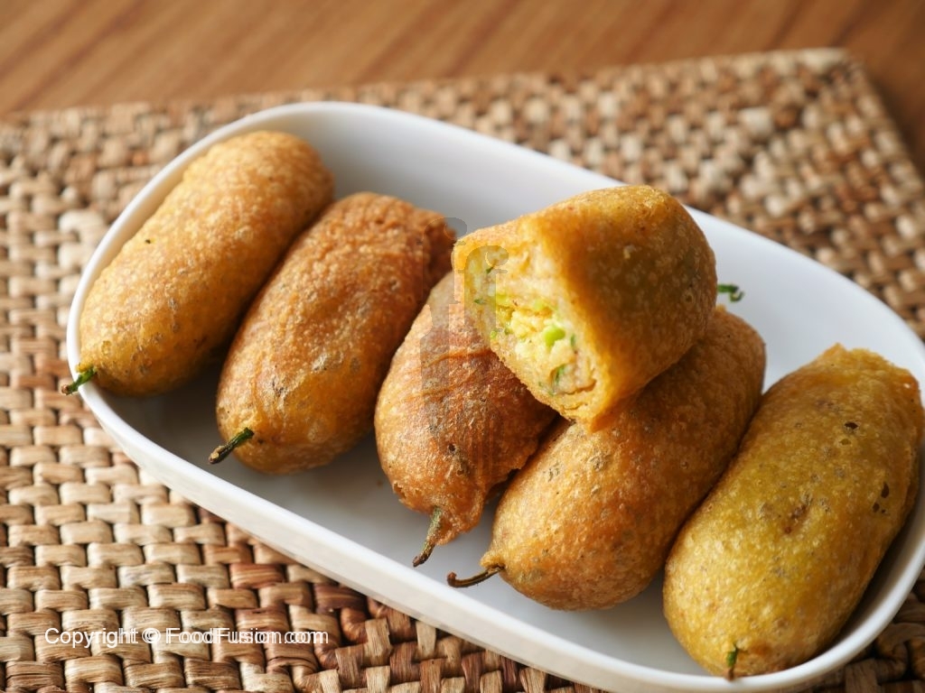 In green chilies,add masala mix or mozzarella cheese with masala mix,coat with potato coating then dip into pakora batter.