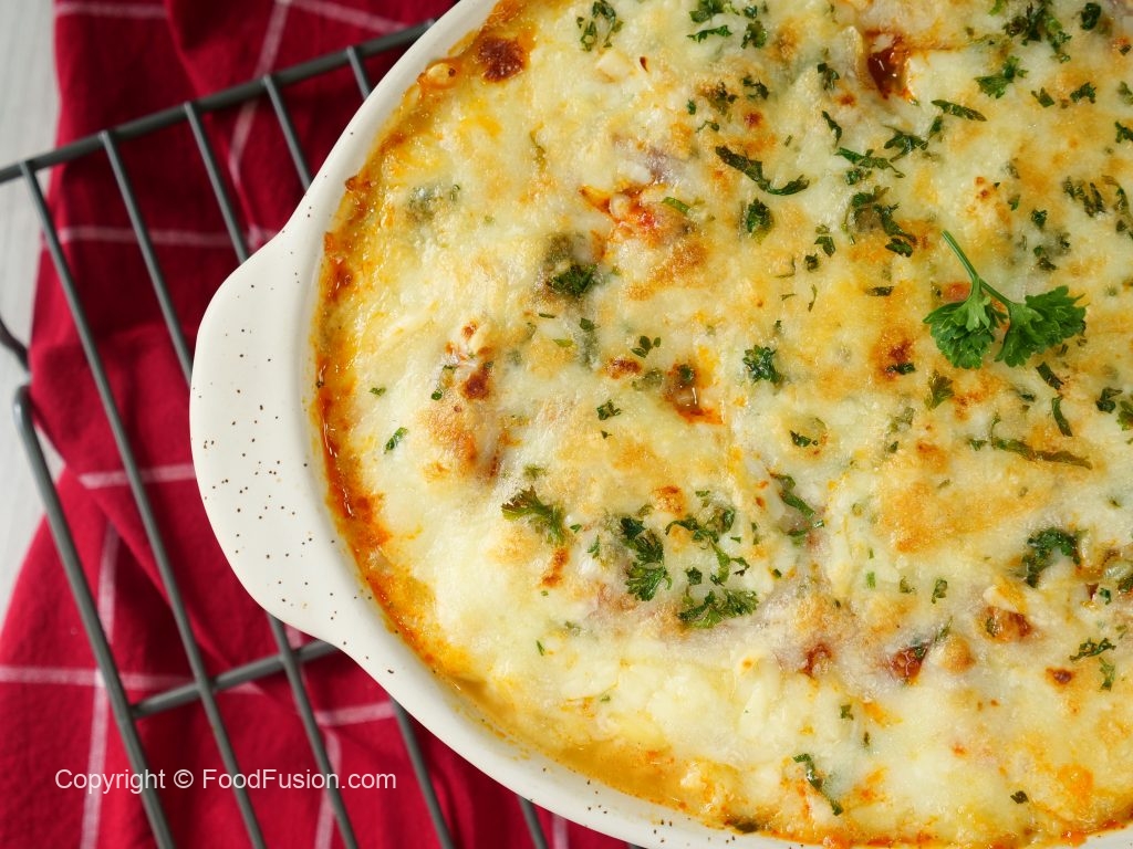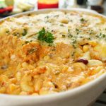 -Baking dish mein tayyar mince mixture,mac & cheese,mince mixture,mac 7 cheese,mince mixture, cheddar cheese,mozzarella cheese & fresh parsley dal dein.