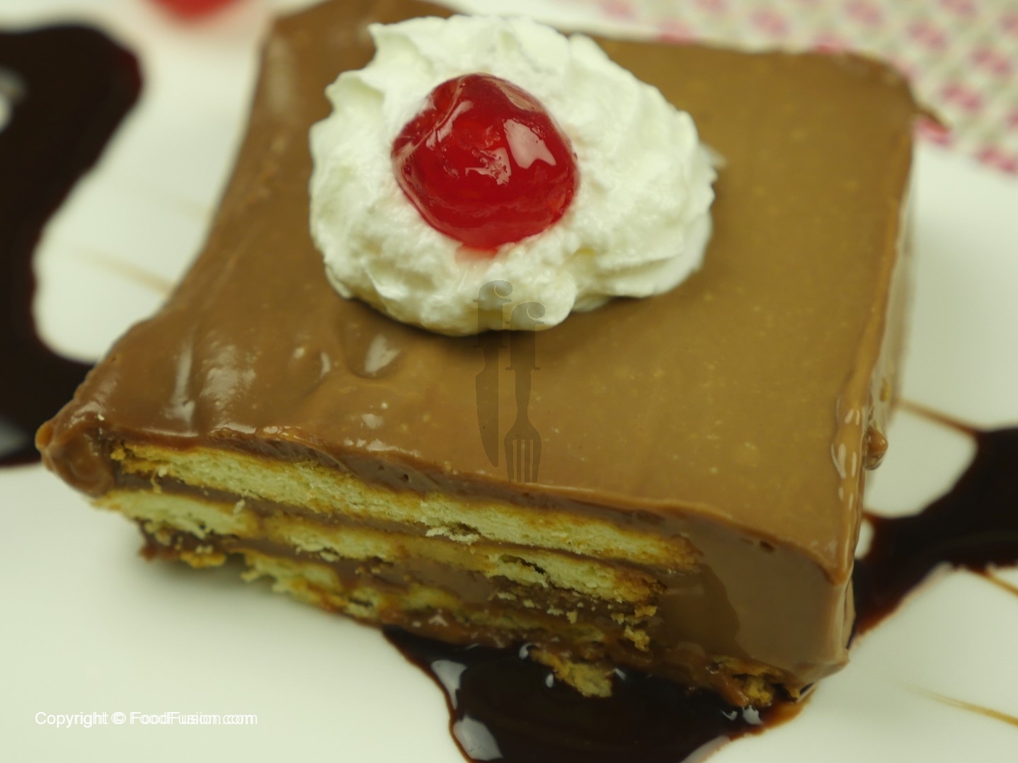 In serving dish, put a layer of biscuits,coffee sauce,chocolate layer then again biscuits, chocolate layer,biscuits,coffee sauce and chocolate sauce .