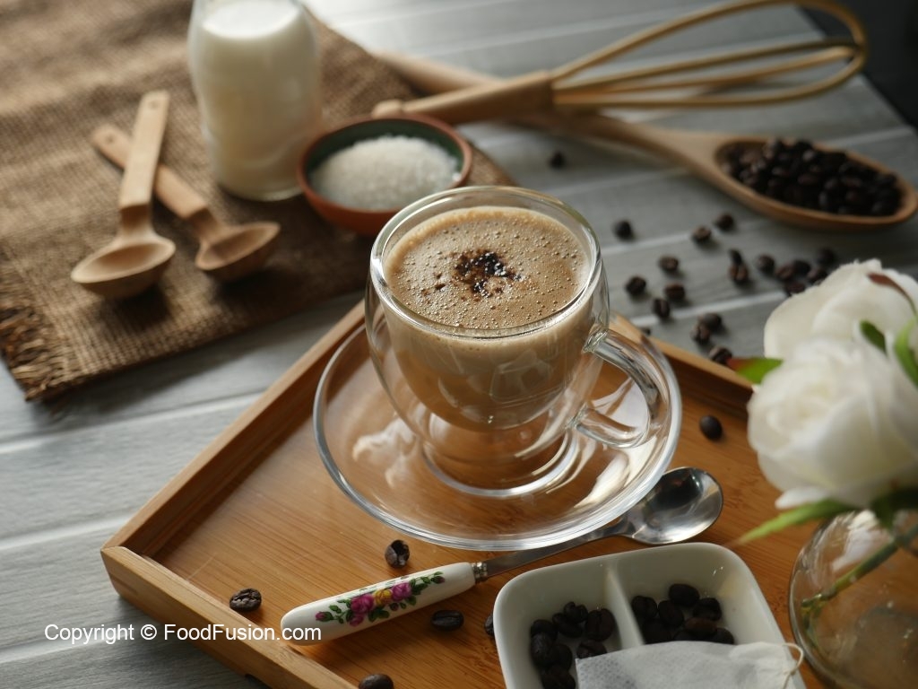 1-2 tbs tayyar coffee base dal ker frothy hunay tak ache tarhan whisk ker lein.