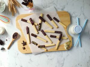-On baking tray lined with baking paper,place cookie sticks & bake in preheated oven at 180C for 10-15 minutes.