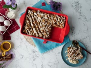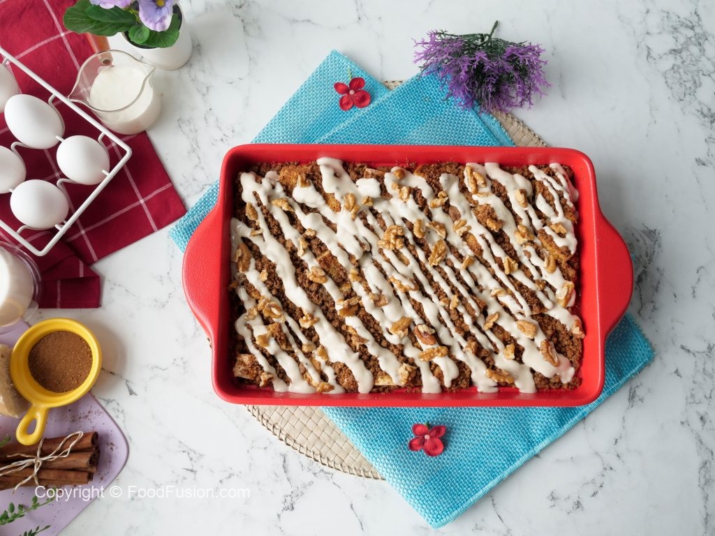 Sprinkle the prepared topping over the soaked bread & bake in preheated oven at 180C for 35-40 minutes (both grills on).