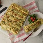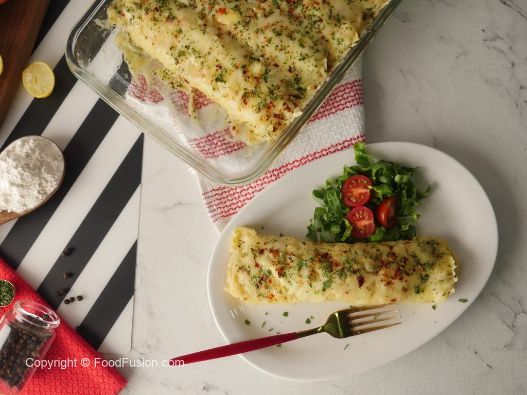 Place stuffed crepe rolls in a baking dish,add cheddar cheese,mozzarella cheese,red chilli crushed & dried parsley.