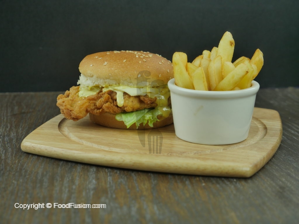 For assembling,take burger buns. Apply mayonnaise on bun. Add ice burg leaf, fried chicken fillet, mayo sauce, cheese slice and then cover with the bun.
