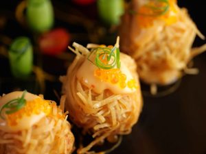 -Garnish with bang bang sauce,caviar,green onion,cucumber & cherry tomato.