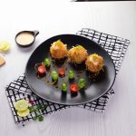 -Garnish karen bang bang sauce, caviar, green onion, cucumber aur cherry tomato ke saath.