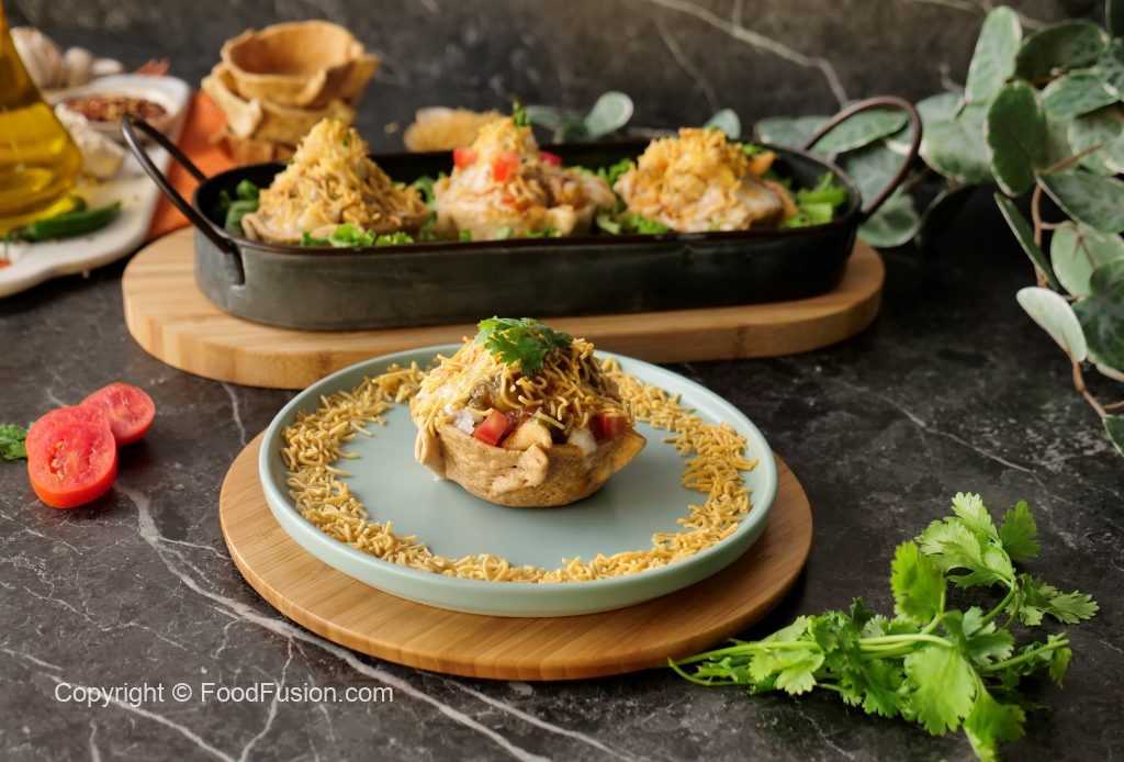 On dough pocket,add bhondi,chaat masala,potato,tomato,onion,spicy hari chutney,imli ki meethi chutney,prepared yogurt,chaat masala,red chilli powder,sev nimco & serve!