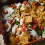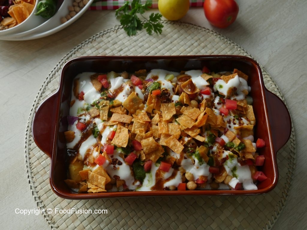 In serving dish,add yogurt,phulkiyan,red chilli crushed,chaat masala,potato,chickpeas,tomato,onion, meethi chutney,green chutney,papri,yogurt,meethi chutney,green chutney,red chilli crushed,tomato, papri & serve!