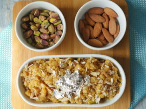 Add fruit cocktail,almonds,pistachios and give it a good mix.