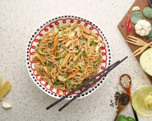 -In a wok,add cooking oil,carrots,capsicum,cabbage,mix well & sauté for a minute & set aside.