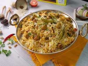-Lemon juice,hara dhania,podina,hari mirchein,fried nuts,boiled chawal,zarda ka rang,biryani essence,podina,hara dhania,hari mirchein,fried nuts aur ghee dal dein,kitchen cloth & lid sa cover karein aur halki ancch per 12-15 minutes kliya steam cook ker lein.